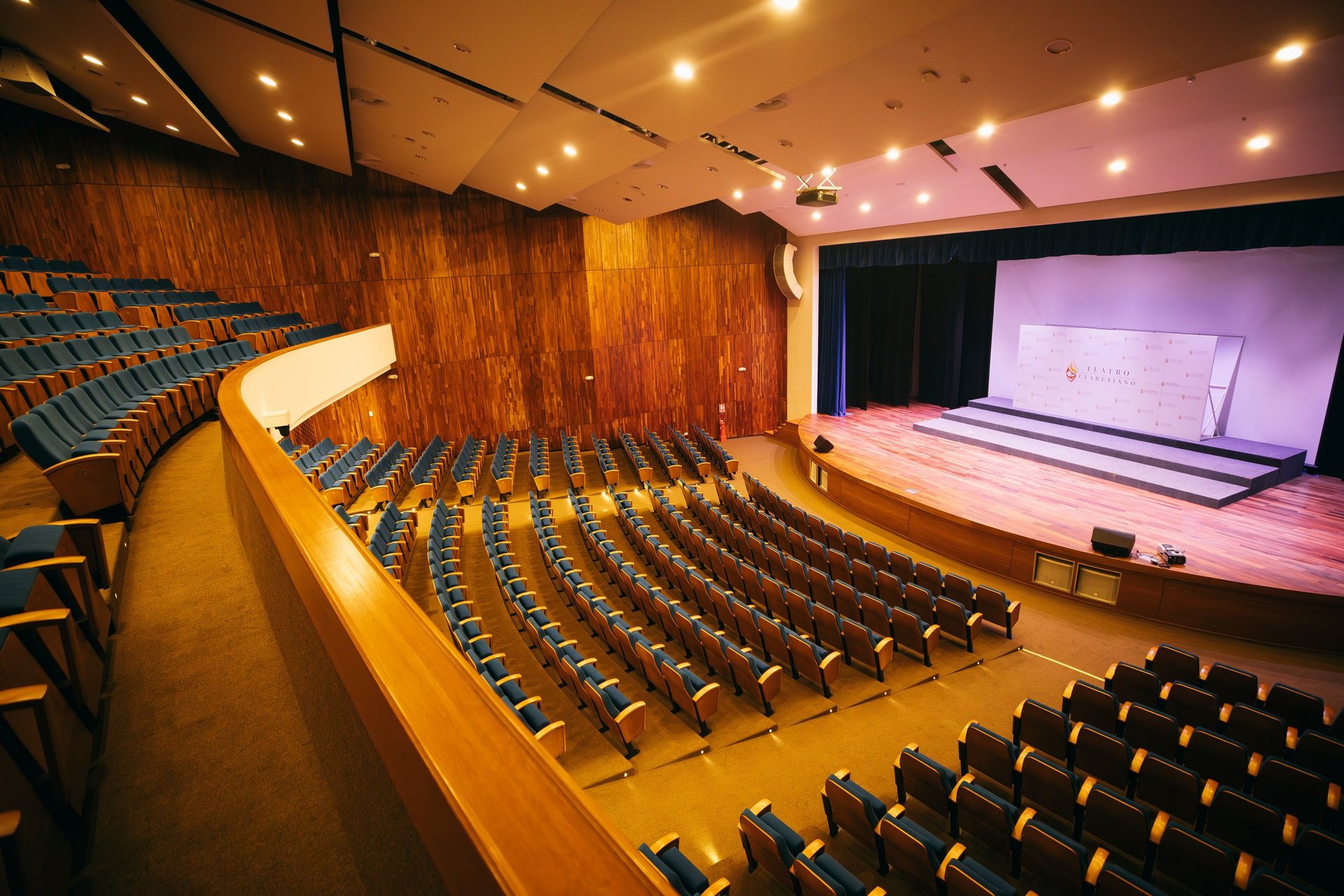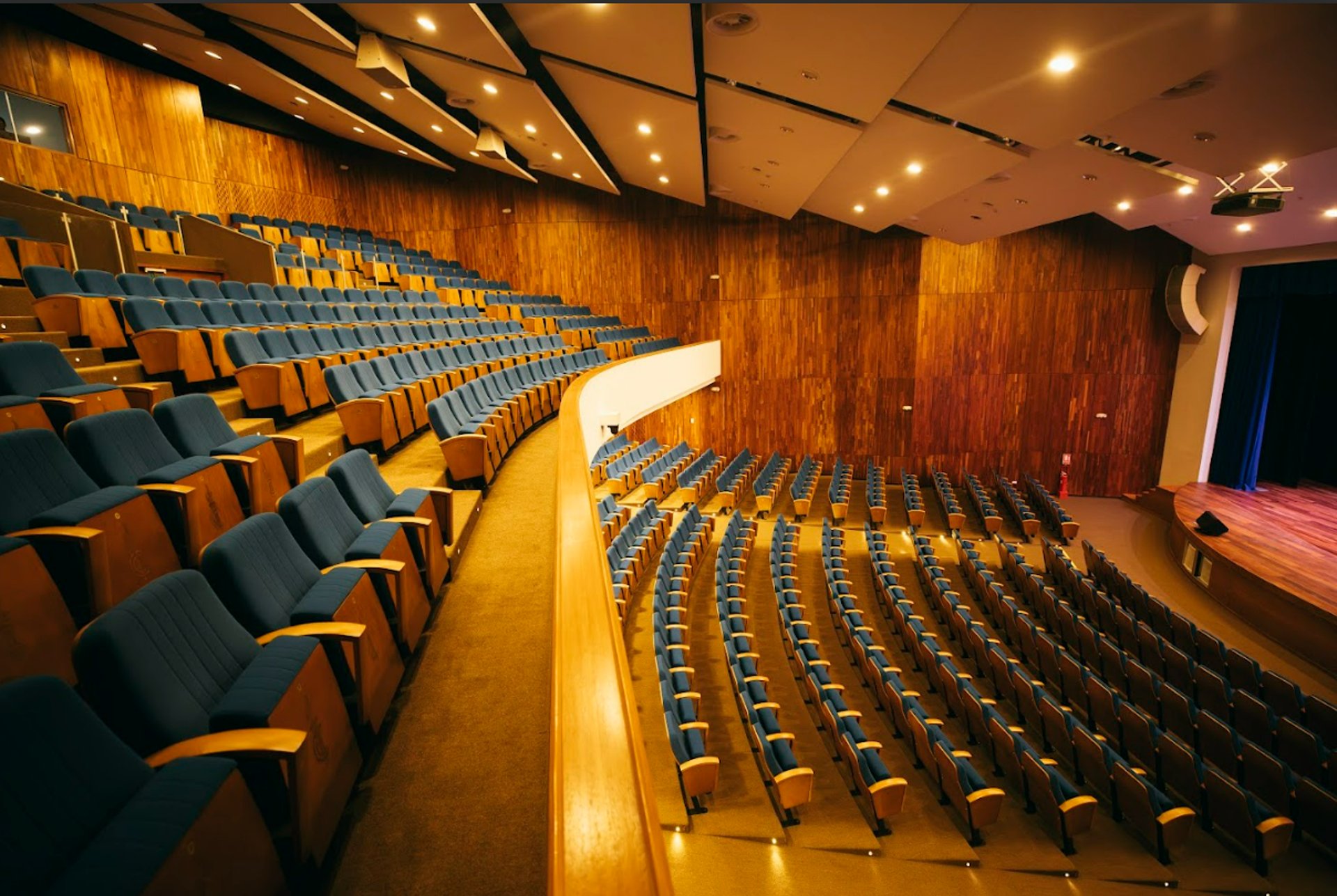 El Auditorio cuenta con una excelente acústica gracias al revestimiento acústico de madera en los muros y la instalación del falso cielo raso con inclinación y revestimiento específico para la absorción acústica.